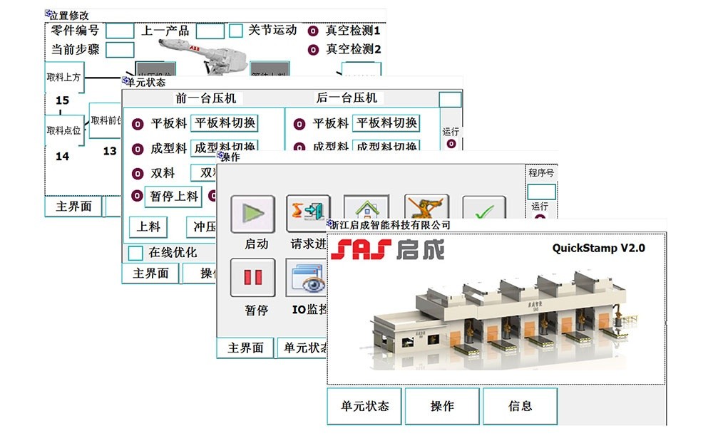 Robot Stamp Ware is a software package specially developed by Qicheng for stamping applications and has been widely praised by domestic and foreign customers. Quick Stamp provides two human-machine interfaces and rich and intuitive icons. Using this software package, customers do not need to learn complex robot programming languages, but only need to use the interface and icons to use the production line flexibly, conveniently and quickly, including: Line work status display and whole line operation; design of various stamping automation technology solutions; robot trajectory teaching; new part import and part parameter setting, etc. (Only Qicheng stamping automation system configures this software package for robots of various brands)