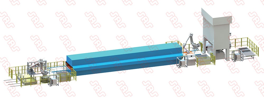 高強(qiáng)鋼熱成形自動(dòng)化生產(chǎn)線是集物料輸送、打碼、加熱、防氧化、沖壓成形、淬火冷卻切 形及噴丸處理等工藝于一體的自動(dòng)化生產(chǎn)線。將高強(qiáng)度鋼板加熱到 900 ~1000℃,沖壓成形并迅速冷卻淬火,實(shí)現(xiàn)奧氏體向馬氏體的相變、從而獲得更高強(qiáng)度(1200 ~1500MPa)和更高硬度的工件,可廣泛應(yīng)用于汽車車身 零件的成形,實(shí)現(xiàn)汽車的輕量化,提高汽車碰撞的安全性。